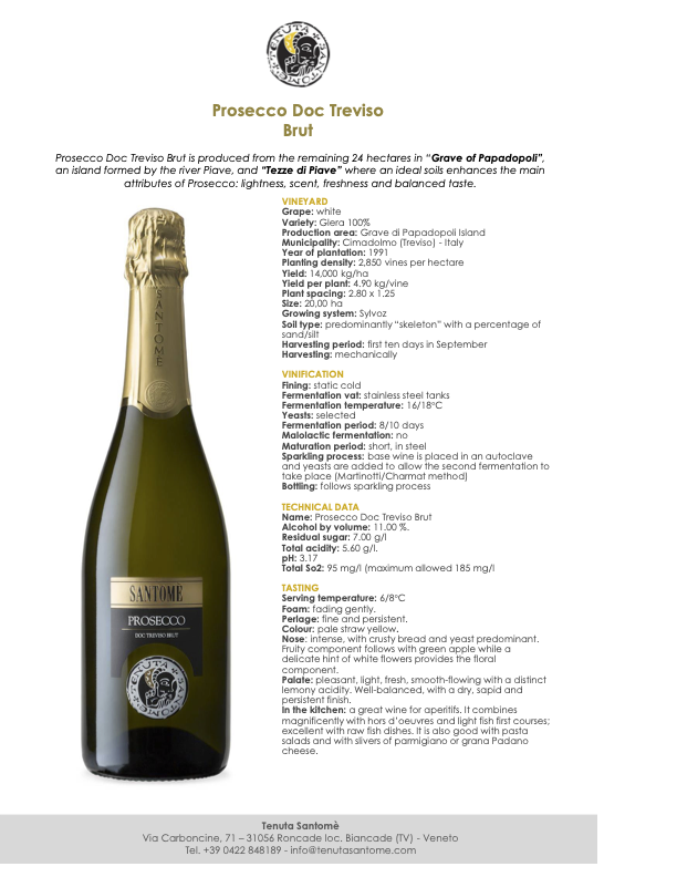 Tenuta Santome Prosecco Doc Treviso Brut NV is a delightful sparkling wine that embodies the essence of Prosecco. It is perfect as an aperitif or paired with light dishes such as seafood, salads, or fresh cheeses.