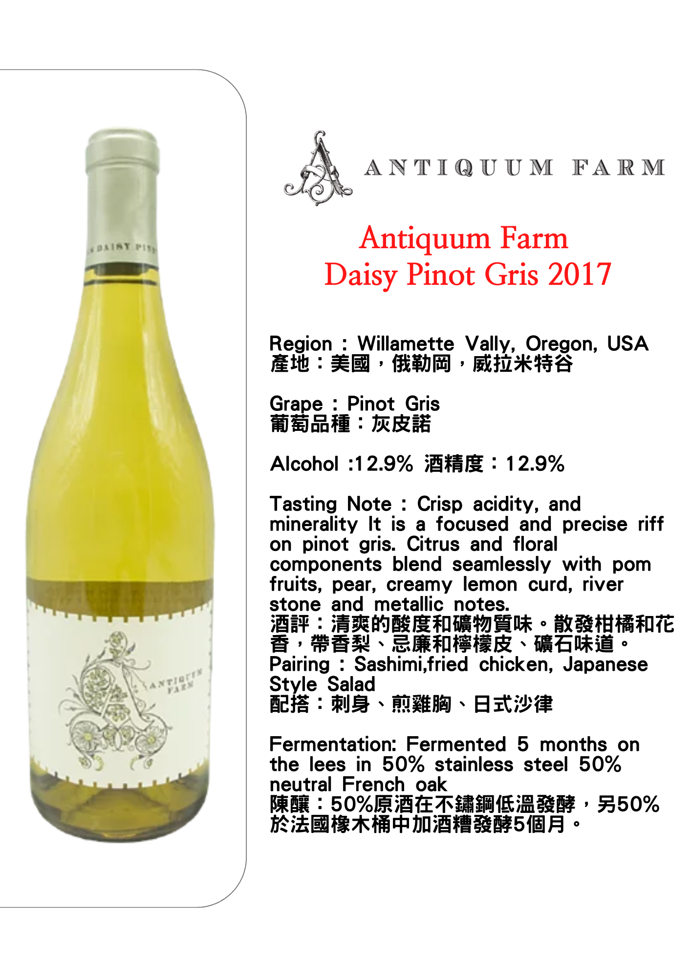 產地:奧勒岡州 美國 葡萄品種:灰皮諾 100% 酒精度: 13%