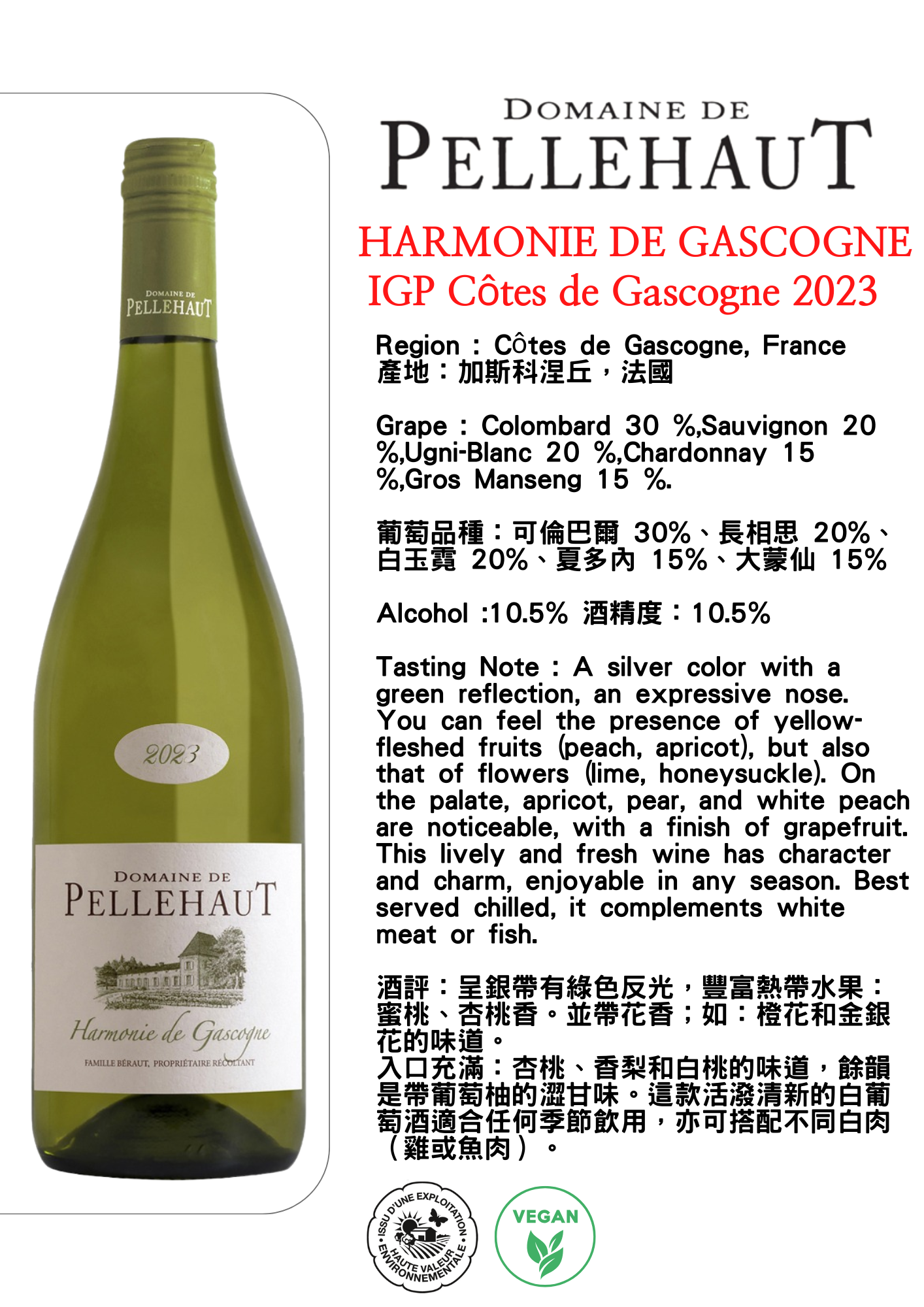 入口充滿:杏桃、香梨和白桃的味道,餘韻是帶葡萄柚的澀甘味。這款活潑清新的白葡萄酒適合任何季節飲用,亦可搭配不同白肉(雞或魚肉)。