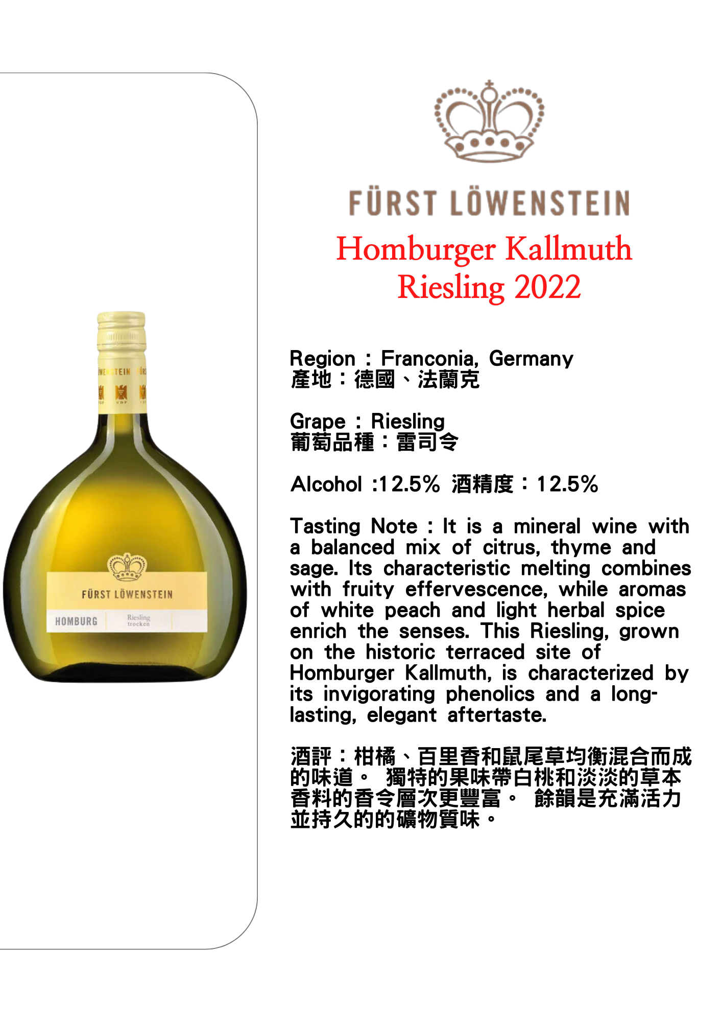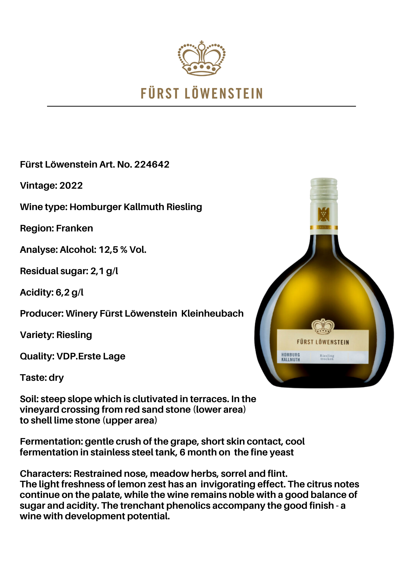 Furst Löwenstein Homburg Kallmuth Rieslng 2022