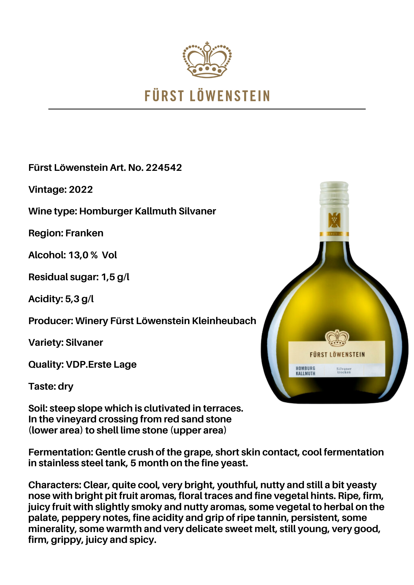 Furst Lowenstein Homburg Kallmuth Silvaner 2022