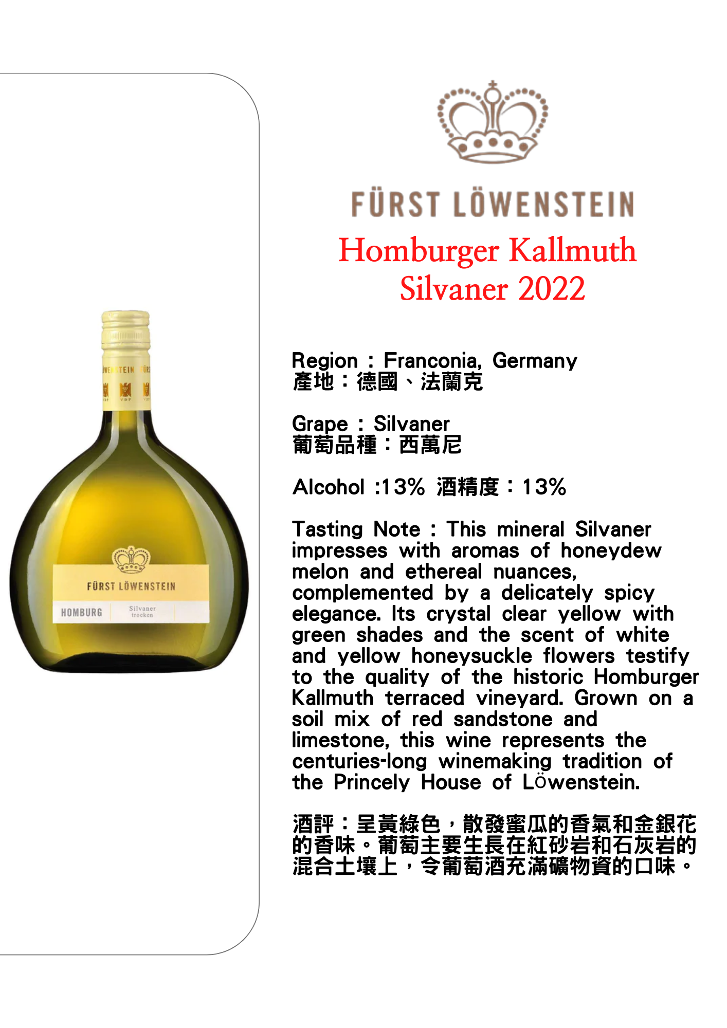 Tasting Note : This mineral Silvaner impresses with aromas of honeydew melon and ethereal nuances, complemented by a delicately spicy elegance. Its crystal clear yellow with green shades and the scent of white and yellow honeysuckle flowers testify to the quality of the historic Homburger Kallmuth terraced vineyard. Grown on a soil mix of red sandstone and limestone, this wine represents the centuries-long winemaking tradition of the Princely House of Löwenstein.