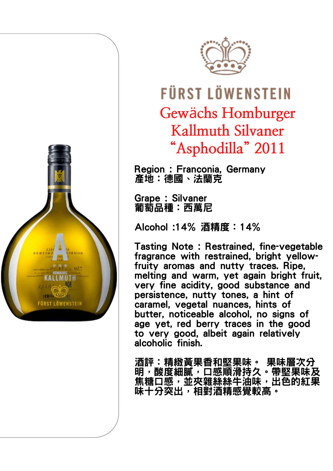 酒評:「Asphodill」以罕見的地中海百合品種命名,並出現在 Homburger Kallmuth葡萄園中。